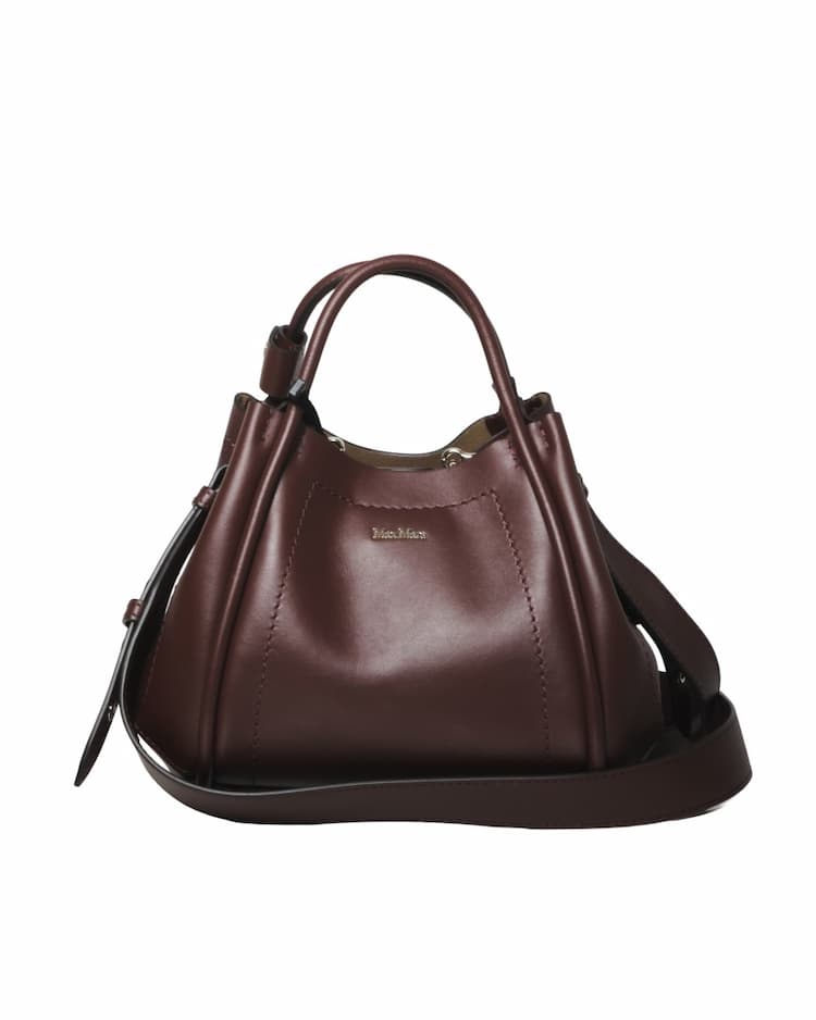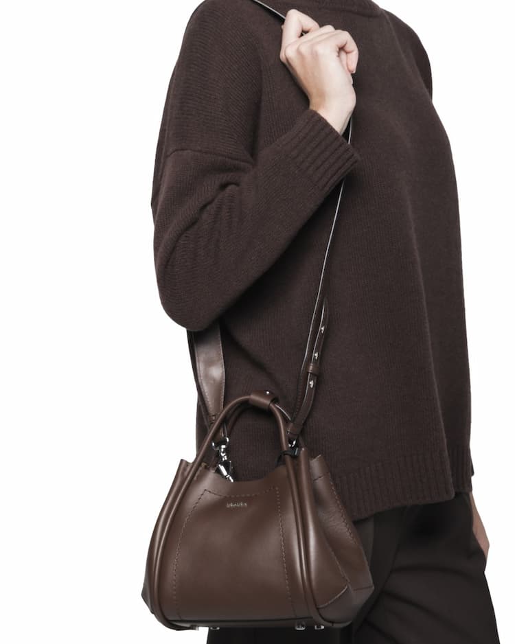 Сумка мини из гладкой телячьей кожи. Модель может приминать разные формы благодаря боковым сторонам, которые складываются с помощью внутреннего ремешка и колец. Внутренняя часть из ткани с мягкой текстурой и плоским карманом. Трубчатые ручки с петлей и съемным регулируемым ремешком.